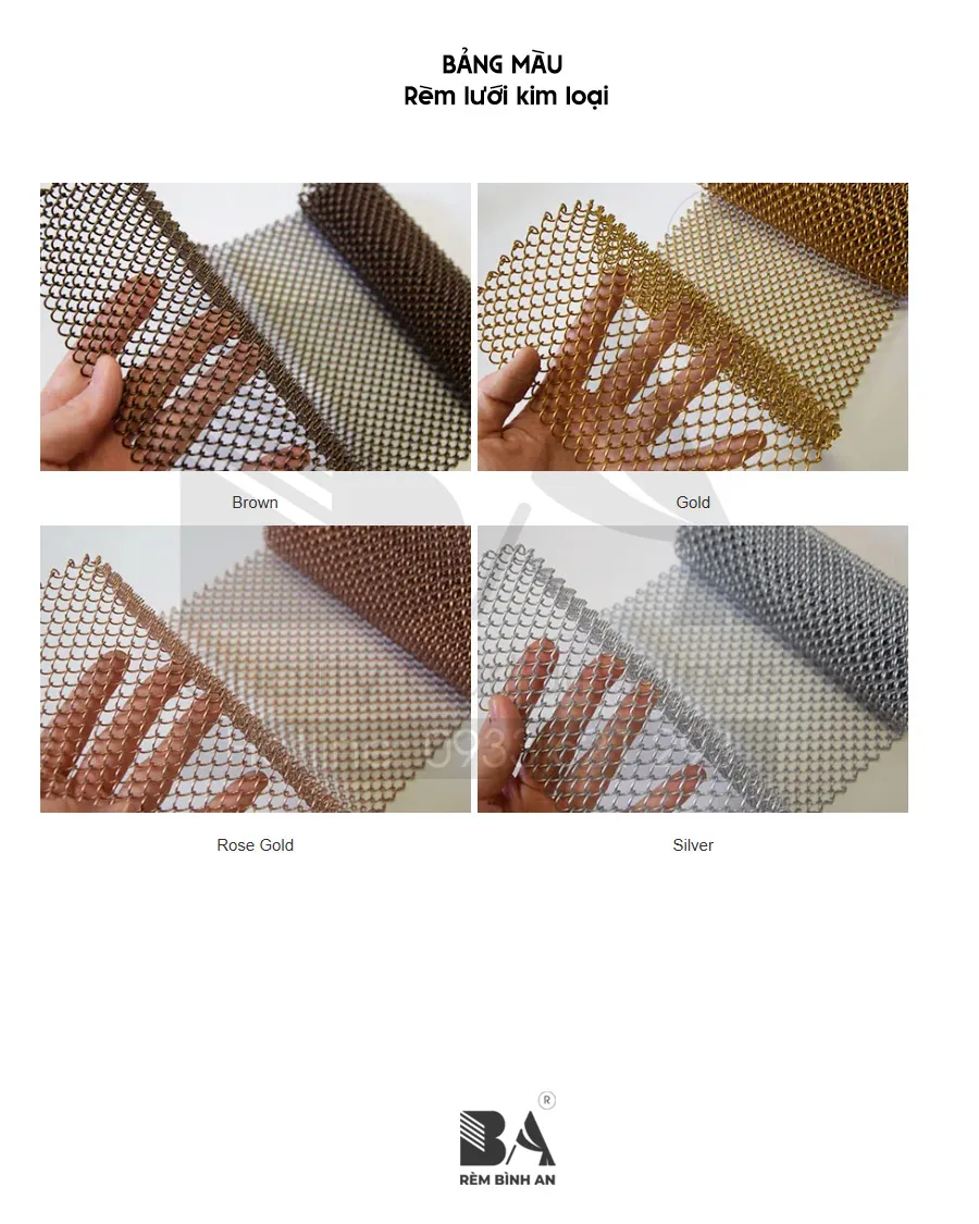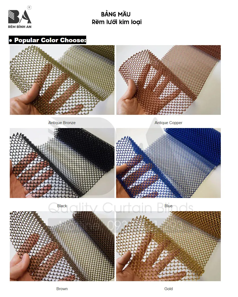 - Bạc, vàng, đồng, đen, đỏ rượu, xám (theo yêu cầu dự án)